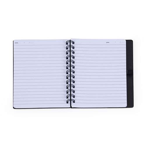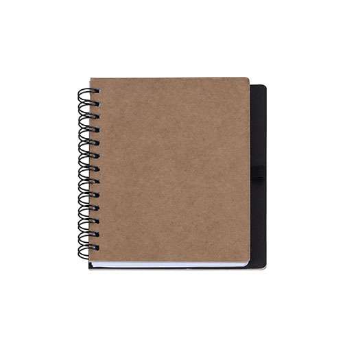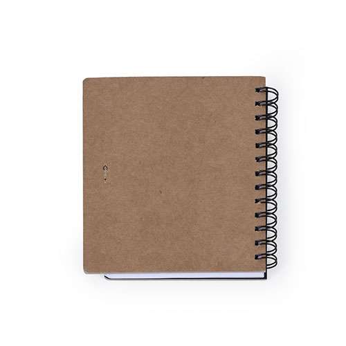 Descrição: Bloco de anotações ecológico com suporte para caneta. Capa de kraft rígida de frente e verso lisa com parte interna preta, possui aproximadamente 100 folhas brancas pautadas com data no cabeçalho. Suporte elástico na parte traseira interna do bloco.