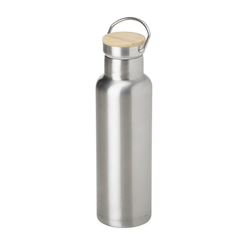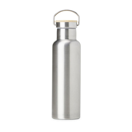 Descrição: Garrafa térmica feita em inox com parede dupla, capacidade de 600ml. Tampa com acabamento em bambu e alça para tranorte.