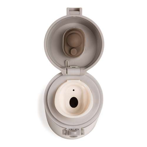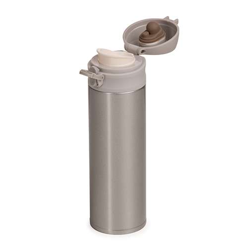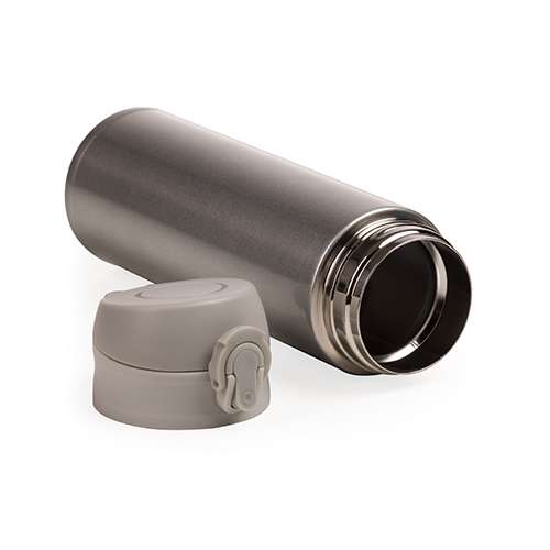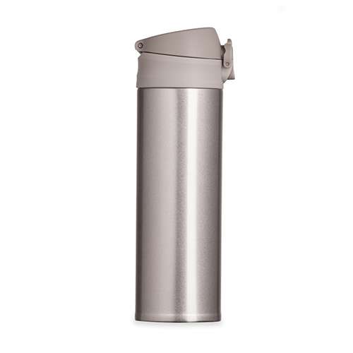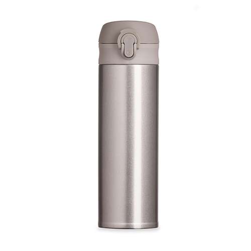Garrafa Térmica 450ml metal inteira colorida com botão de abertura prata. Possui um sistema de trava (basta mover para cima/baixo para abrir/fechar), pressione o botão centra para abrir a tampa(possui na parte interna borracha pro