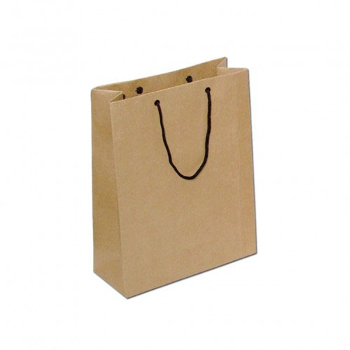 Sacola em papel Kraft Pardo 120 g/m² com ilhós e alças de cordão polipropileno. Com fundo reforçado.