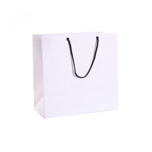 Sacola em papel Off-Set Branco 180 g/m² com ilhós e alças de cordão polipropileno. Com fundo reforçado.