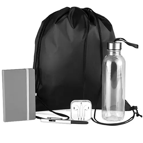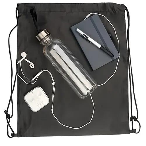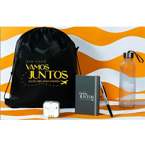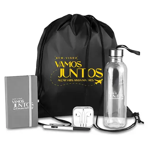 DESCRIÇÃO: Kit boas vindas. Conta com mochila sacola preta em nylon 210D, caderno para anotações cinza com capa dura, garrafa transparente em PET, fone de ouvido e caneta esferográfica em ABS prata.